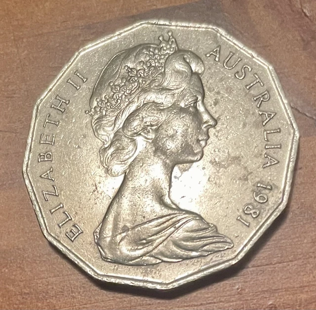 Summary. Australia Fifty Cent, 1981 Mint: Royal Australian Mint, Canberra 24,168,000 fifty cent coins were struck at Canberra in 1981.. Physical Description. A twelve-sided cupru-nickel coin (31.5 mm diameter with plain edge) featuring on the obverse a diademed bust of Elizabeth II right; around, ELIZABETH II AUSTRALIA 1981 The reverse is based on the arms of the Commonwealth of Australia, as.