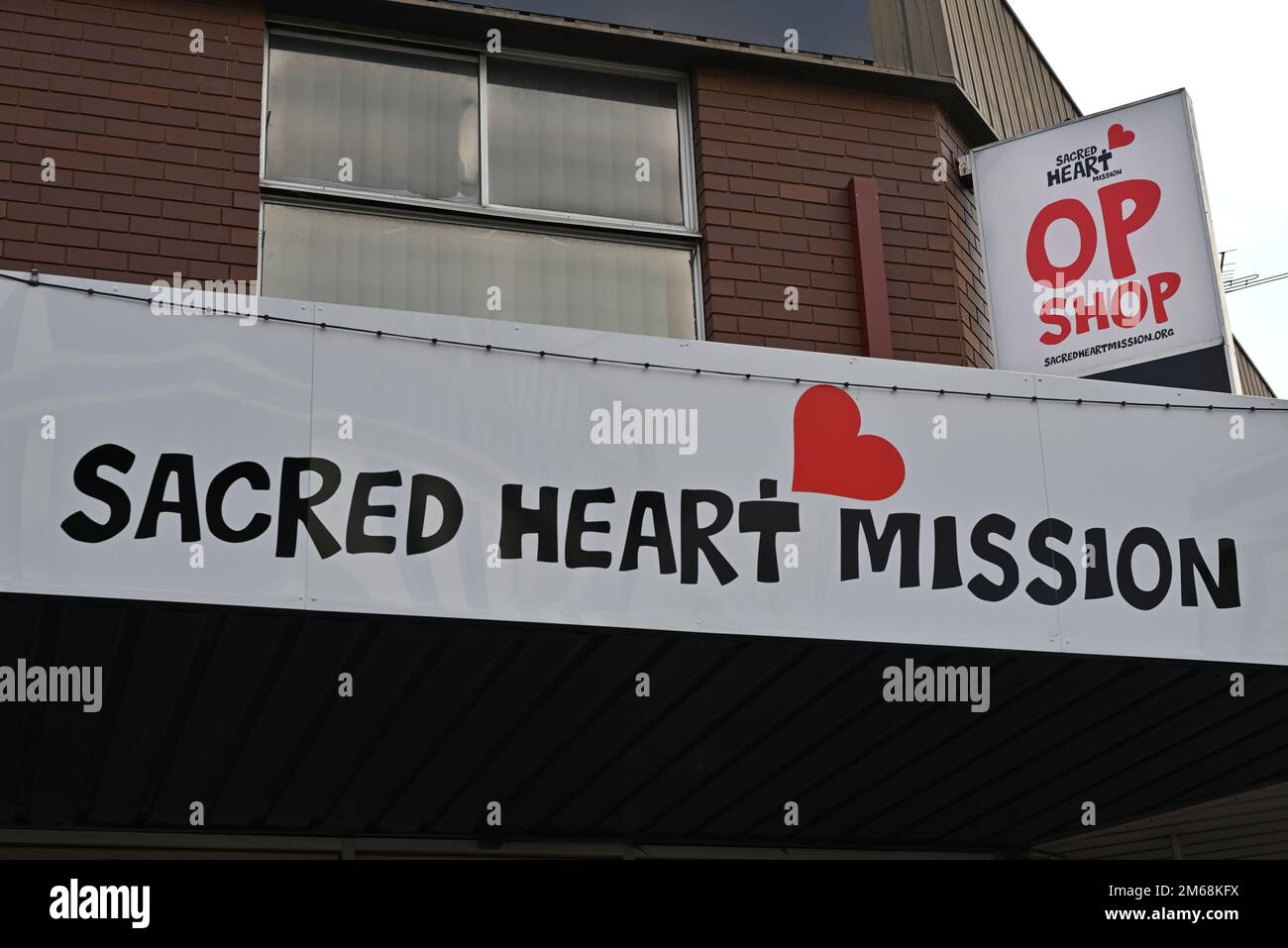 Signage for the Sacred Heart Mission Op Shop, on Glen Huntly Rd, above the store's entrance