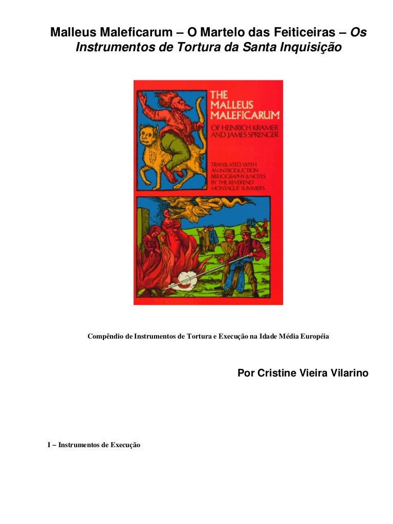 irrestrito leitor, cidadão do mundo livre da internet, nossa versão brasileira da primeira parte do Malleus Maleficarum. Alex H.S. - Brasil, verão de 2007.. (O martelo das bruxas) foi escrito em 1486 por dois monges dominicanos. No ato, e ao longo dos três séculos seguintes, se converteu no manual indispensável e a autoridade