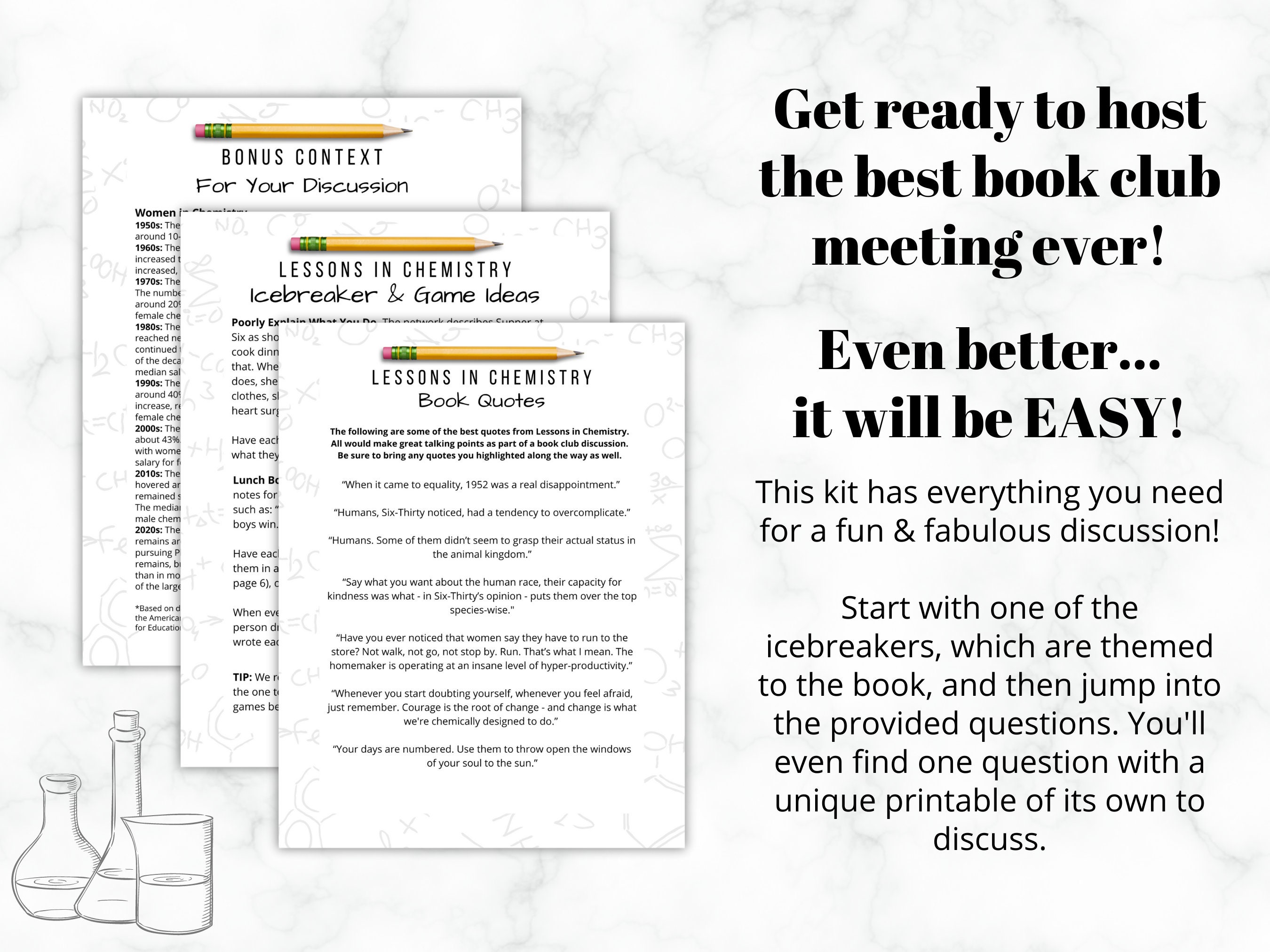 Conclusion. These thought-provoking Lessons in Chemistry book club questions and ideas help you have a meaningful meeting and discussion of the reader-favorite book about feminism in America in the 1950s and 1960s.. It's also the kind of book you can have a lot of fun with at book club, from watching the adaptation to cooking delectable treats.