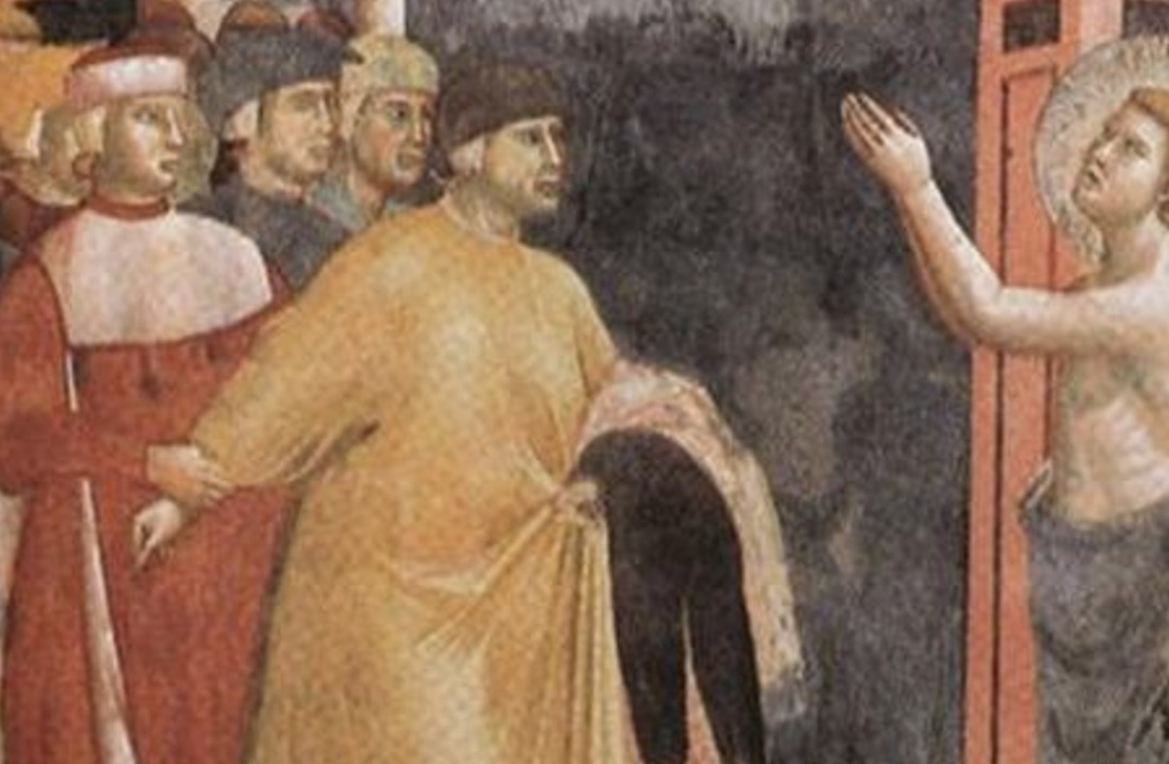 La rinuncia ai beni nelle Storie di Francesco - Il vero significato dell'affresco di scuola giottesca della rinuncia ai beni da parte di Francesco, è racchiuso nei suoi stessi particolari pittorici. L'opera appare nella chiesa della Basilica superiore di Assisi, nel registro inferiore della navata centrale dedicato alle Storie di Francesco (lato nord, seconda campata ovest).