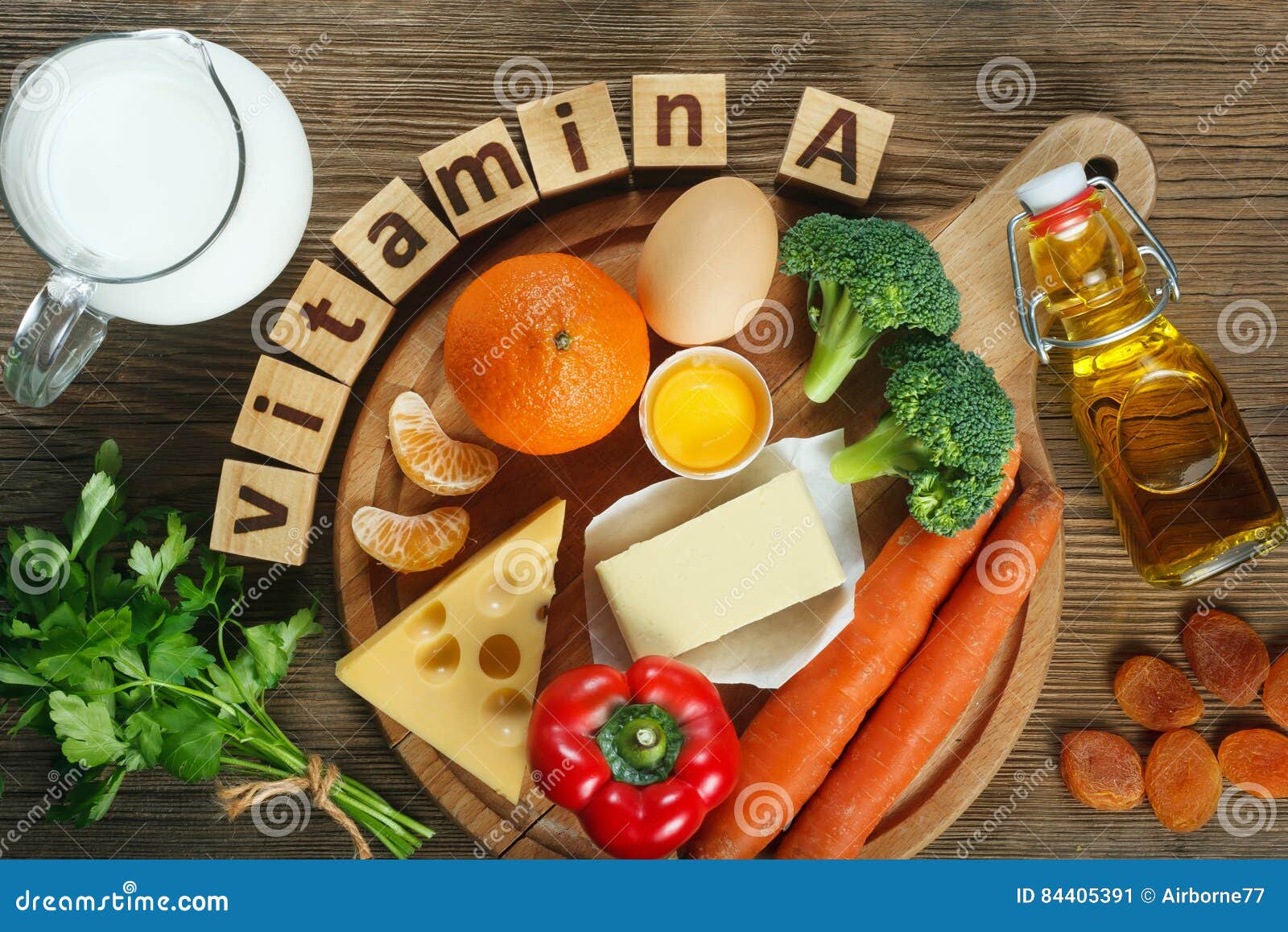 Voedingsmiddelen met vitamine A: Eieren: 0,126 mg; Roquefort kaas: 0,294 mg; Wortelen: 0,692 -1,5 mg Snijbiet: 0,33 mg; Cheddar kaas: 0,337 mg; Boter: 0,38 mg; Andijvie: 0,4 mg; Geitenkaas: 0,4 mg; Tonijn: 0,45 mg; Boerenkool: 0,5 mg; Zoete bataat: 0,7 mg; Waterkers: 0,7 mg; Zoete aardappel: 0,7 mg; Spinazie: 0,8 mg; Ghee: 0,84 mg; Paksoi: 1 mg.