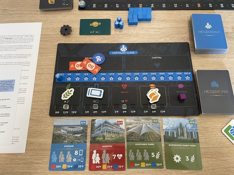 Hegemony is an asymmetric politico-economic card-driven board game for 2-4 players that puts you in the role of one of the socio-economic groups in a fictional state: The Working Class, the Middle Class, the Capitalist Class and the State itself. The Working class controls the workers. The Capitalist class controls the companies.